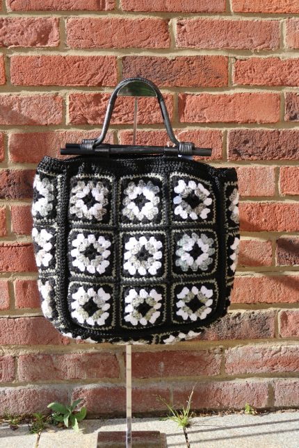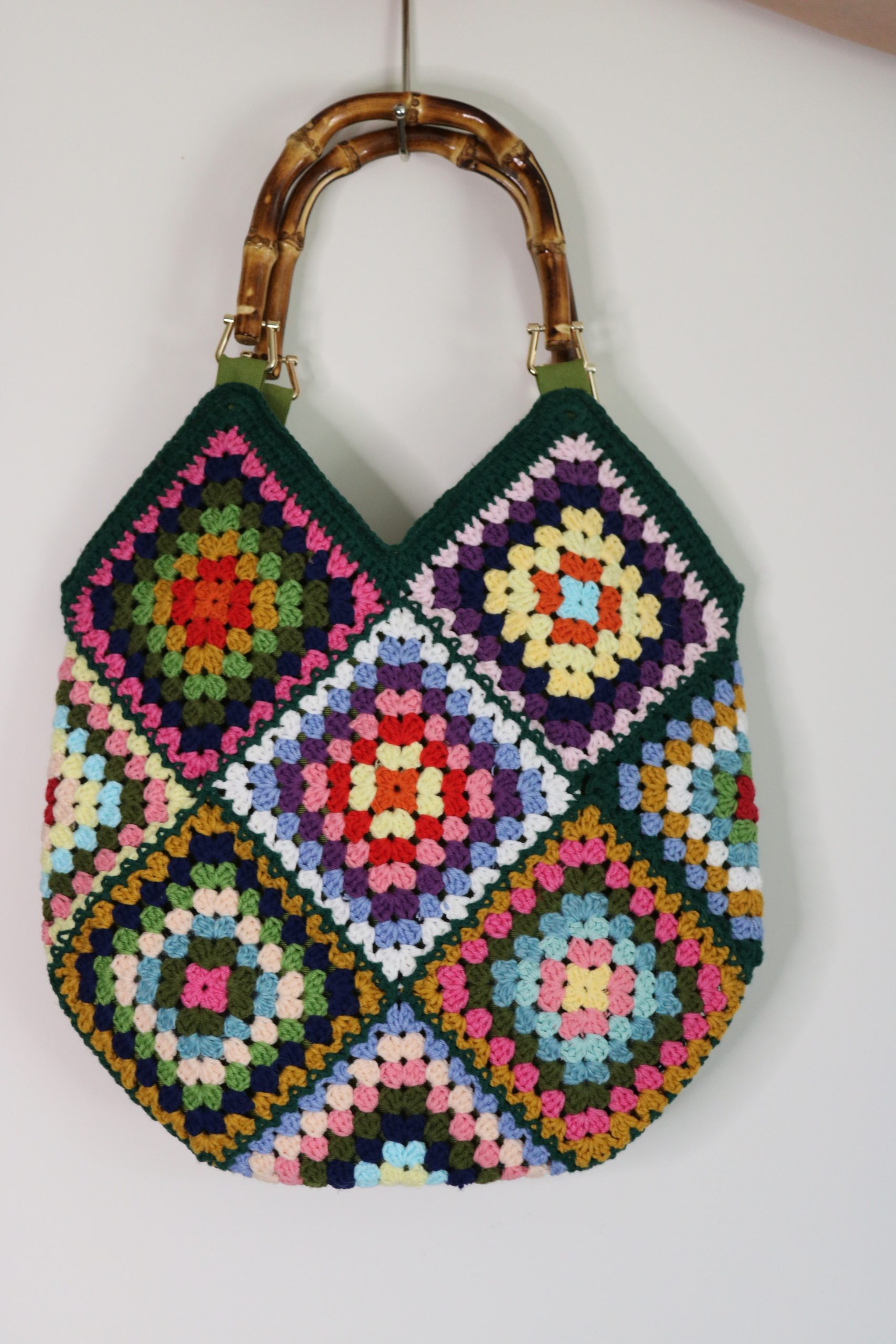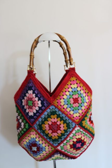 Handmade crochet tote with vibrant granny squares and bamboo handles, a perfect boho accessory for any day.