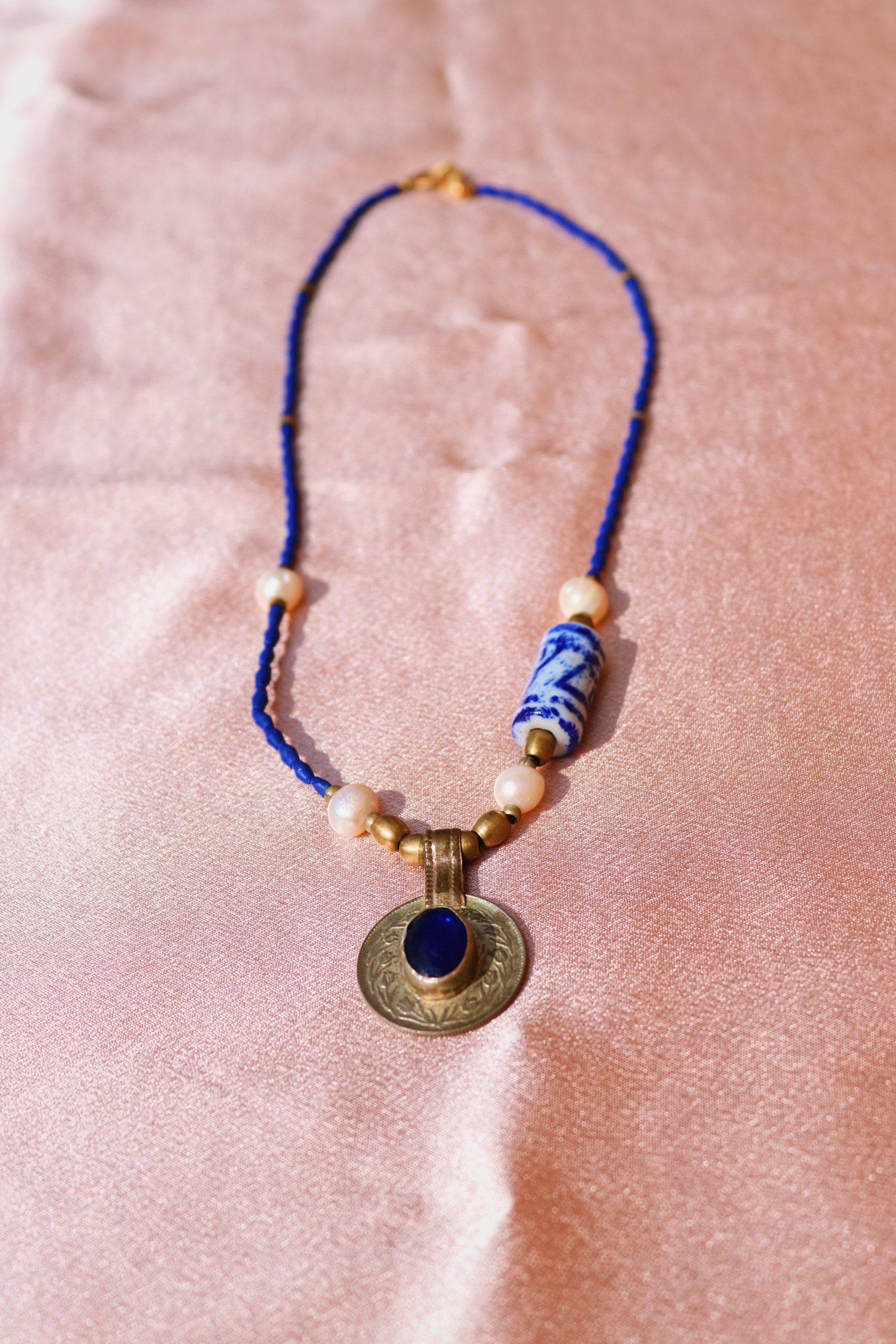 This elegant necklace features a delicate string of small, vibrant blue beads, creating a striking contrast against the ivory-coloured accent beads at the center. The ivory beads are arranged in a slightly curved line, flanked by golden beads and pearls on each side, adding a touch of sophistication and warmth to the design.