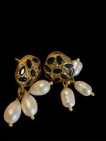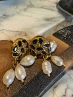 Meet the cool toned sister of our much loved Emerald Garden design. Each circular medallion is cast in bronze, then hand pierced to create a lace like lattice that cradles deep sapphire blue glass cabochons and tiny clear crystal accents. Three baroque style freshwater pearls crown every drop, their organic shapes softening the jewel bright discs below. Polished by hand and sealed with a clear, hypo-allergenic lacquer. Light yet eye catching, these earrings bring a touch of decadent garden party glamour to the everyday.