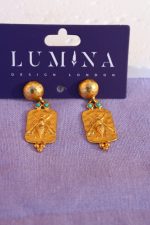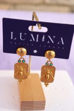 These artisan earrings feature a sculpted bee a universal symbol of community, creativity and prosperity set on a rectangular gold-plated panel with two small turquoise accents. The hammered stud top adds texture and elevates the design, while the 22K gold plating gives a warm, luminous finish.