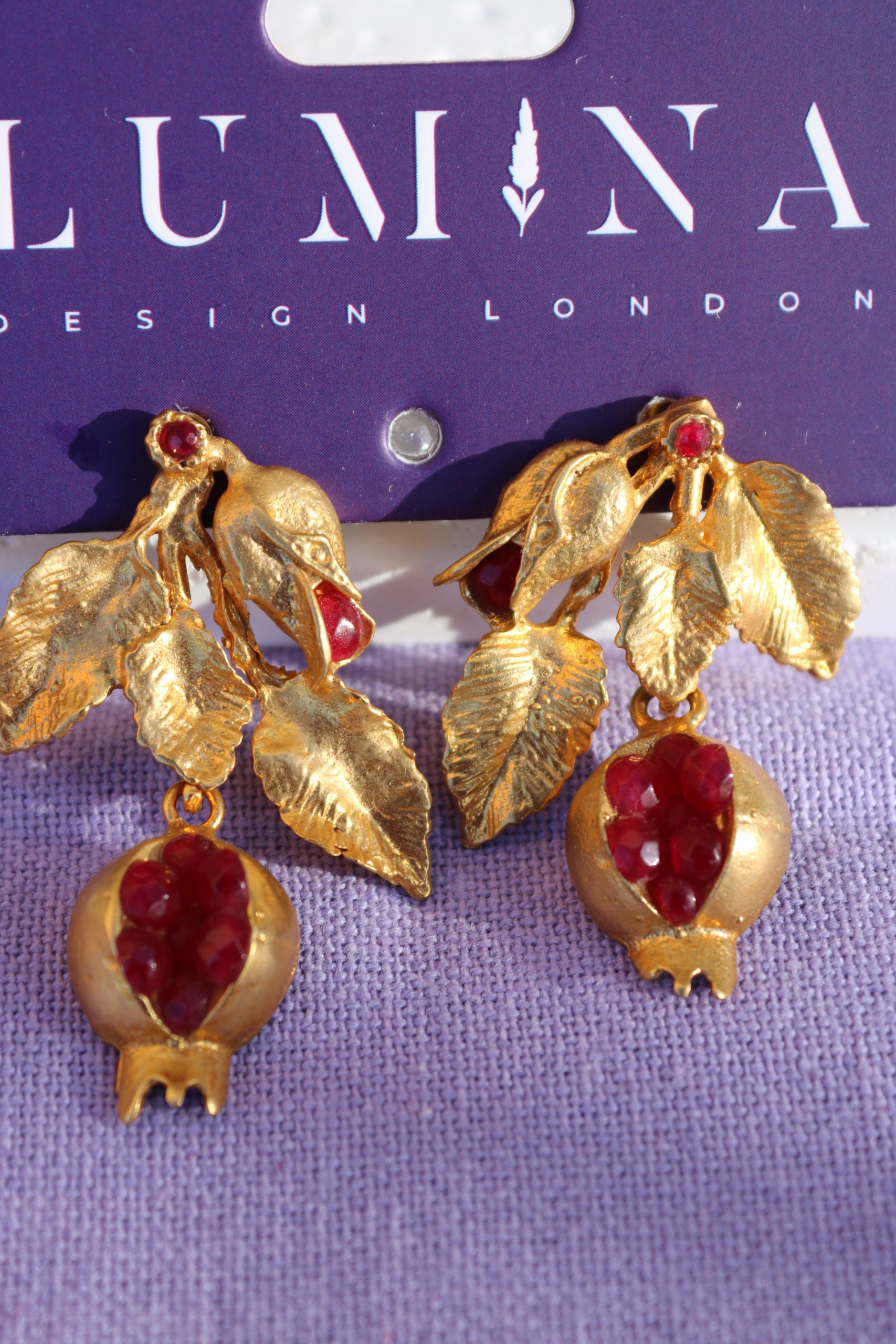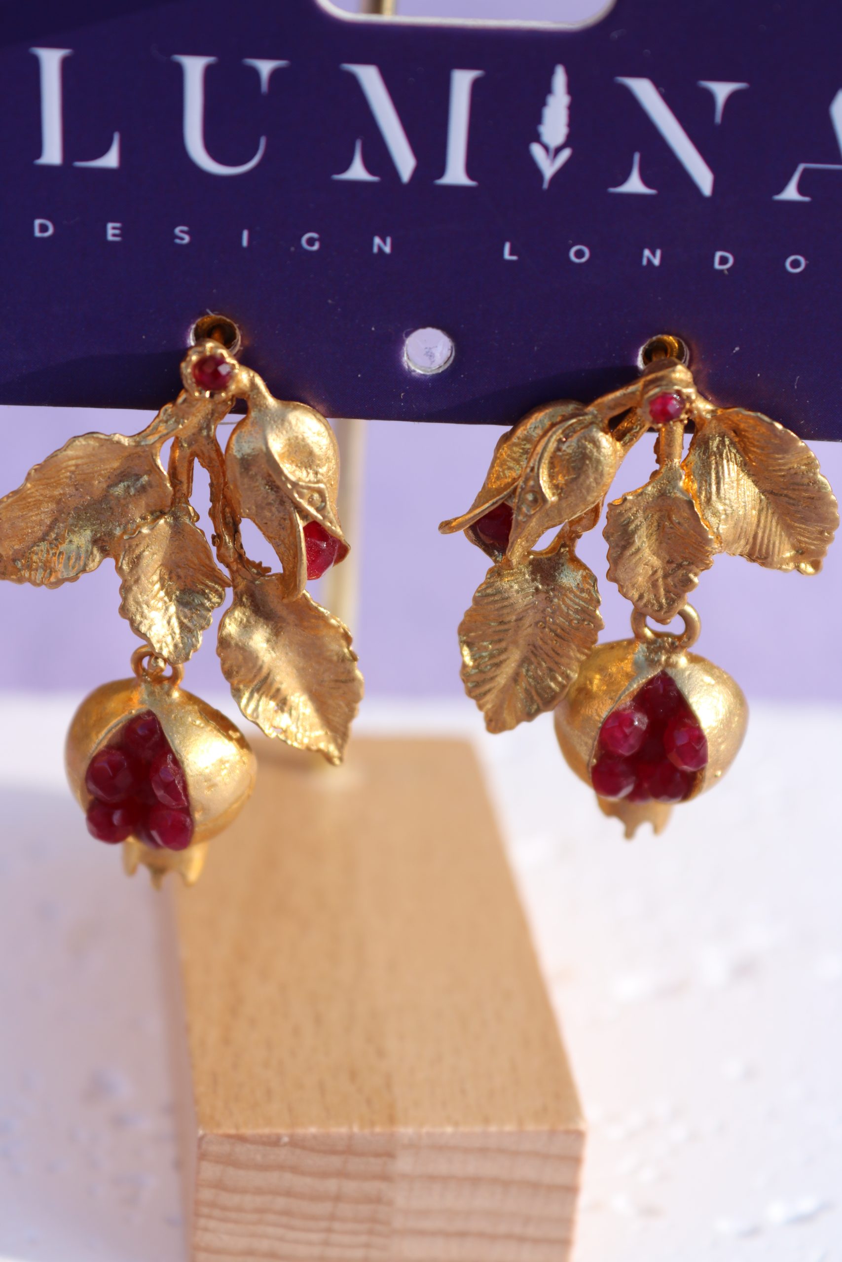 These artisan earrings combine textured botanical details with a meaningful symbol: the pomegranate, long associated with luck, fertility, prosperity and cultural storytelling. Each pair is crafted in 22K gold plating with sculpted leaves, a small red stone bud and a pomegranate drop filled with faceted red stones that mimic real seeds.