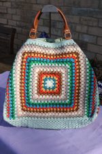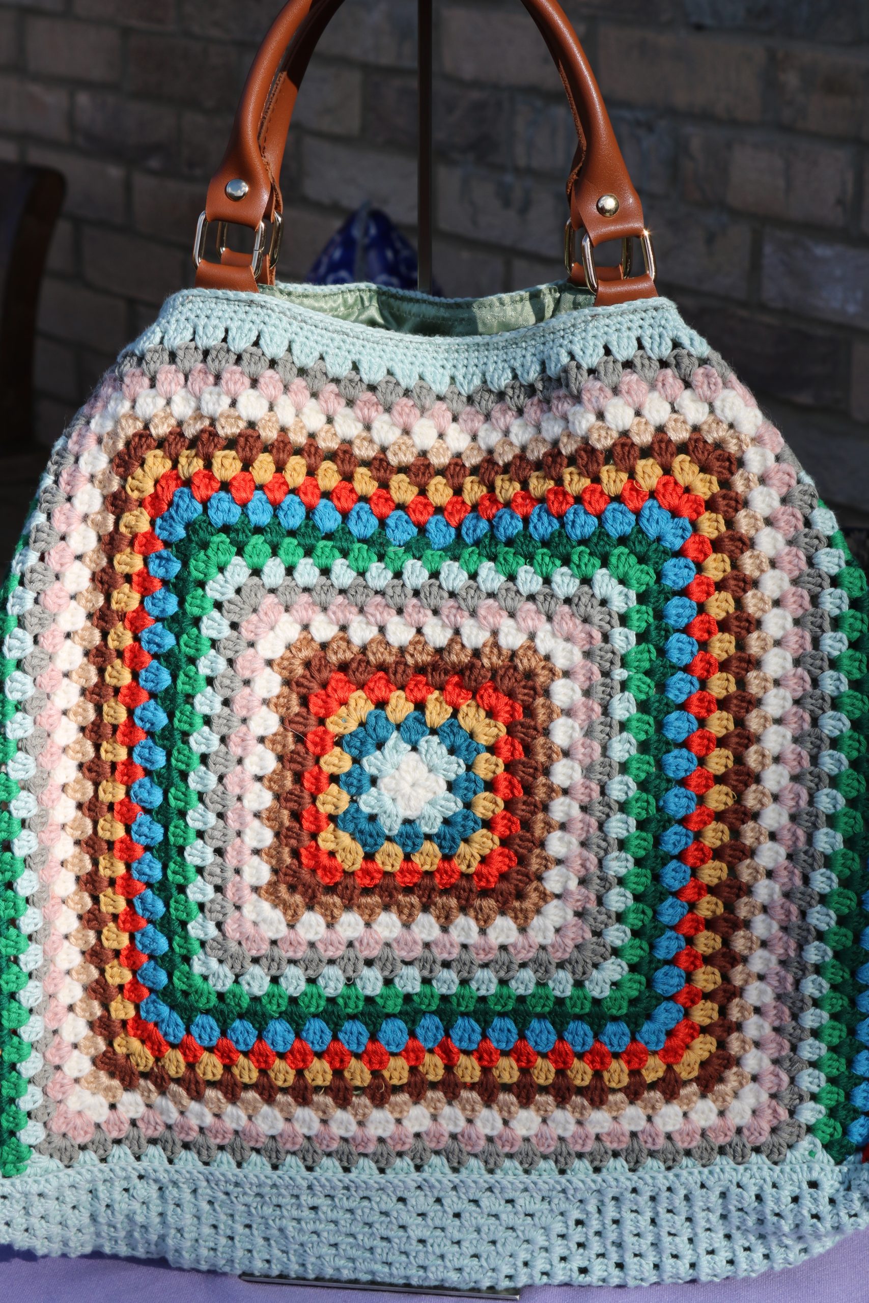 A vibrant handcrafted granny square tote made from 100% cotton yarn, finished with sturdy leather handles. Spacious, lightweight and full of character, perfect for everyday use or statement styling.