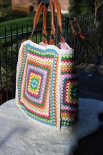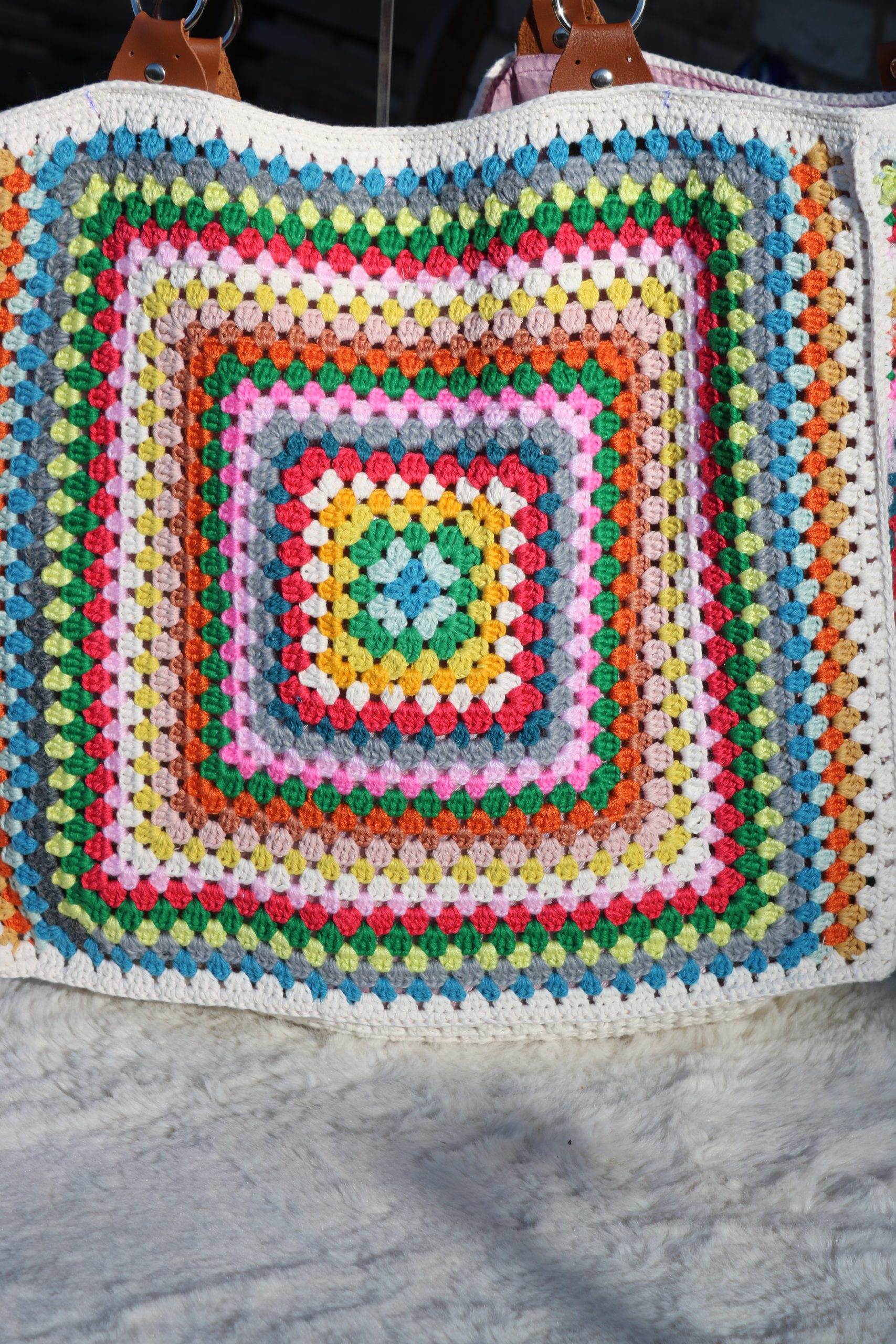 A one-of-a-kind handmade crochet tote bag featuring a colorful granny square design and durable leather shoulder handles. Perfect for everyday use or as a unique boho gift.