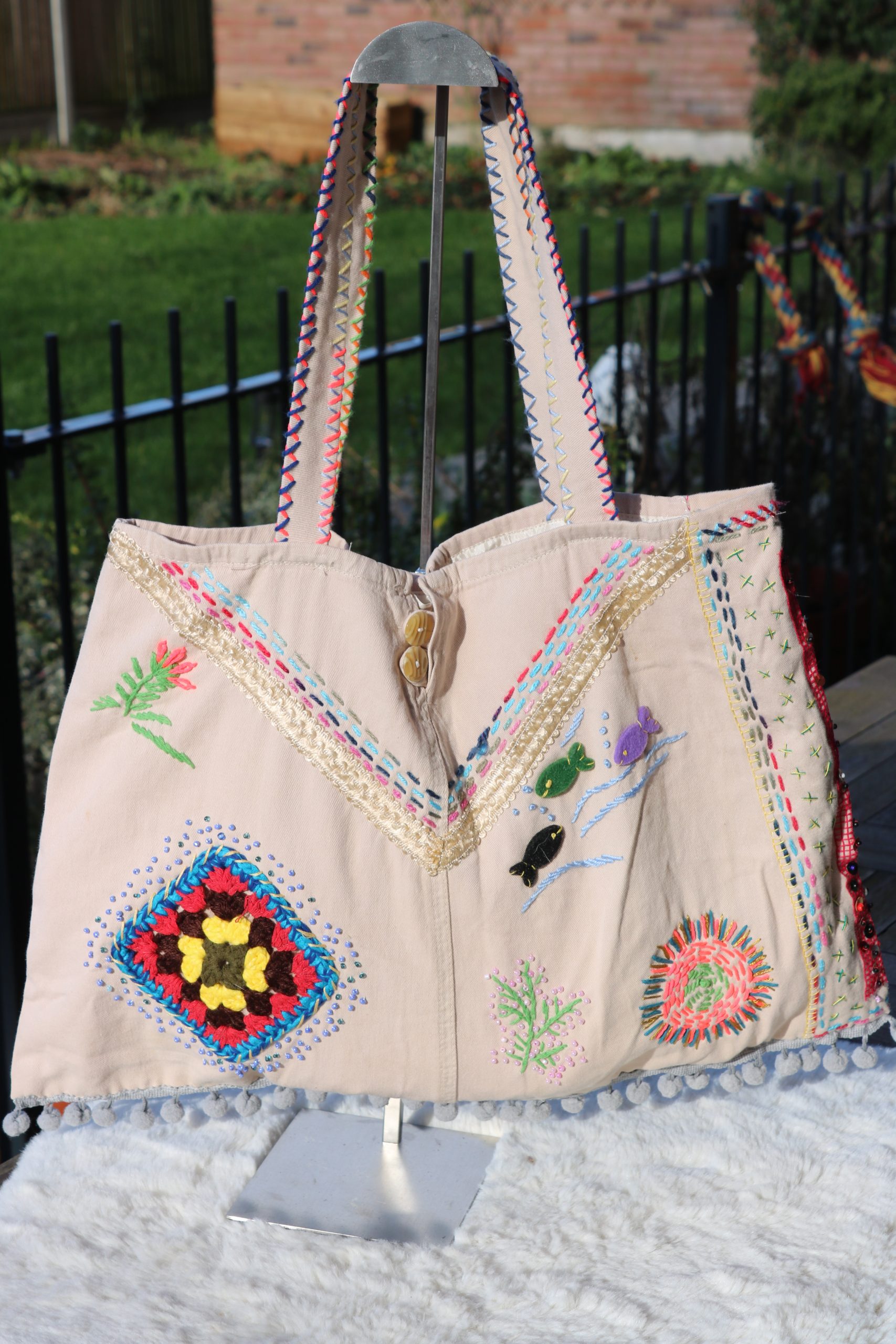 Created using upcycled fabric, the bag is decorated with a mix of hand embroidery, crochet motifs and colourful stitched details, each added individually by hand. No two sides are the same, making this tote a completely one-of-a-kind piece.