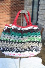 Carefully crocheted using a mix of upcycled yarns, this tote showcases layered horizontal stripes in earthy and vibrant tones, finished with striking red crochet handles. Each bag is made individually, meaning no two are ever the same.