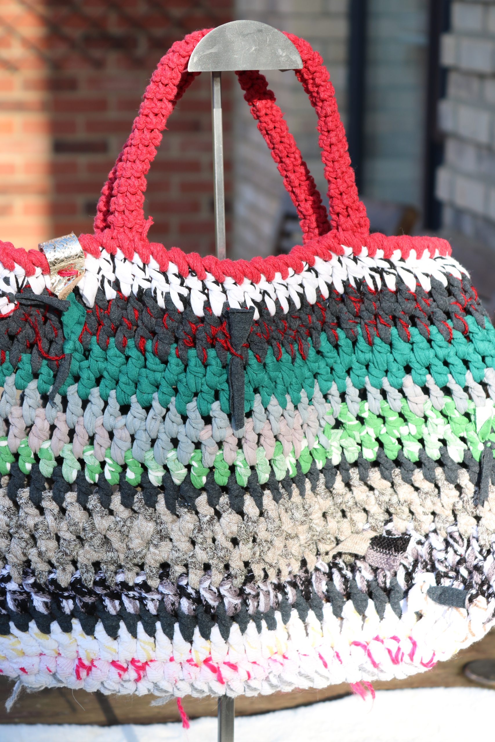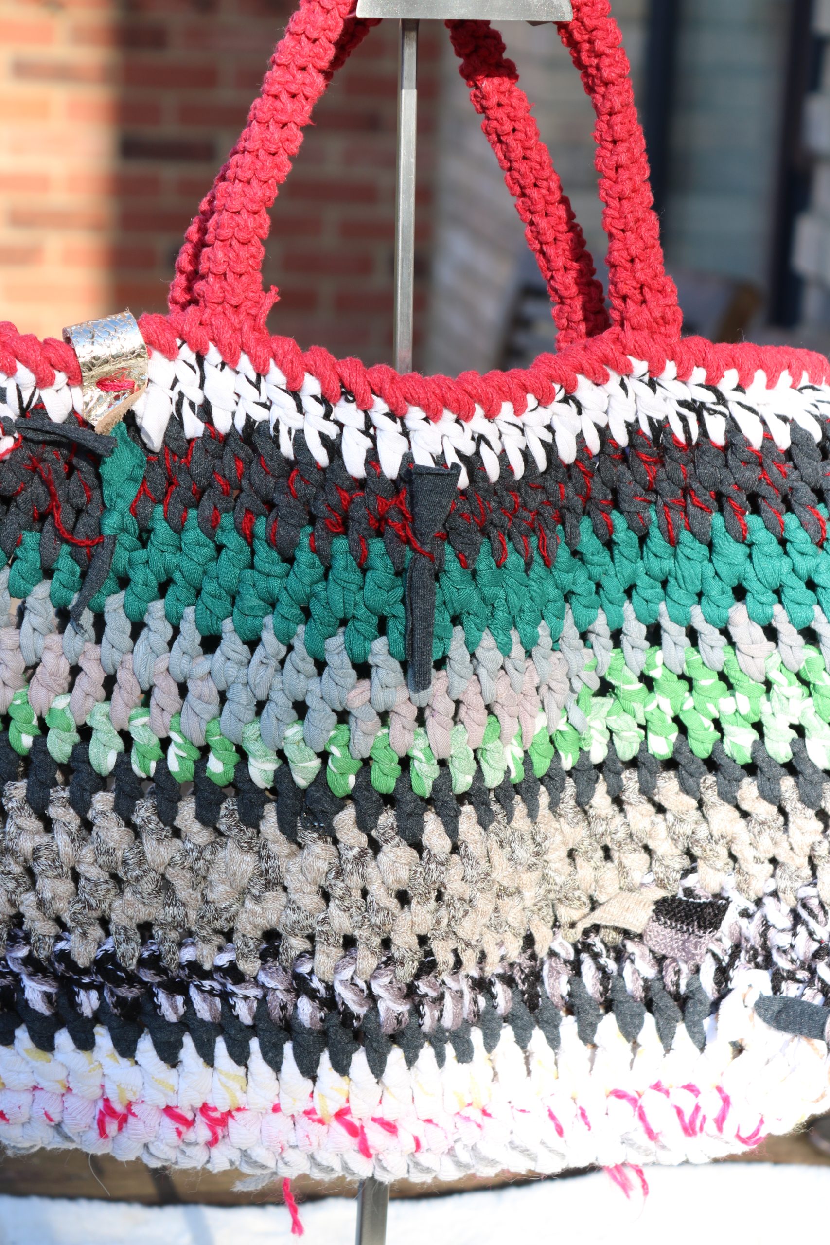 A bold, handmade crochet tote featuring rich multicolour stripes and red handles. One of a kind, crafted slowly using upcycled yarns.