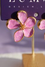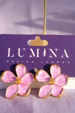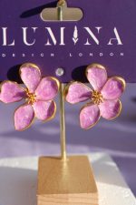 A romantic floral statement piece for any season. These handcrafted earrings feature five shimmering lavender enamel petals, delicately framed in gold-plated brass for a soft yet luxurious finish. Designed to add colour and elegance to everyday outfits, occasionwear and summer looks.