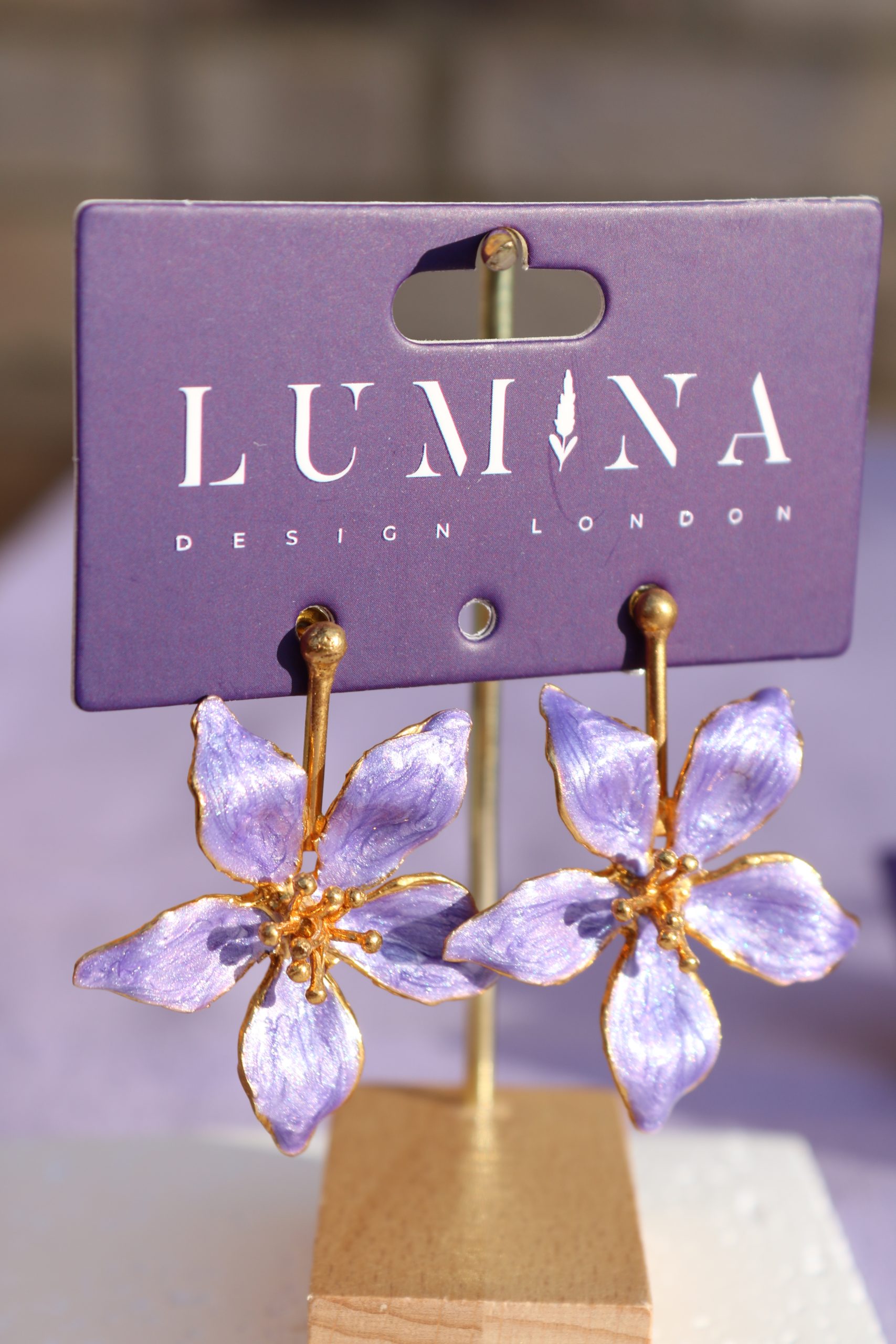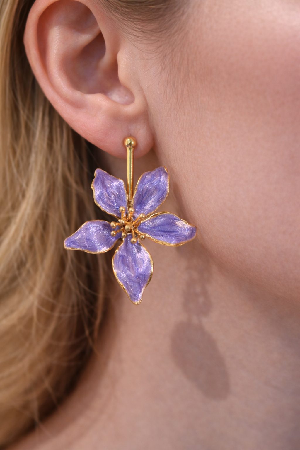 Each earring features five hand-painted enamel petals in a soft iridescent lavender tone, framed with 22k gold plated edges and a sculptural gold centre.